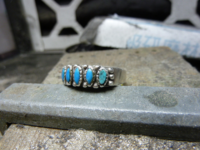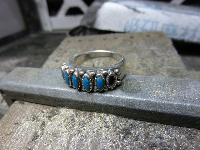 マーキス型のターコイズが連続してセットされたインディアンジュエリーの修理を承りました。