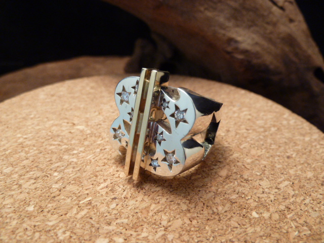 レール留めだった留め方を爪留めに変更し平打ちリングに引っかかりが出来ないようデザインしました。