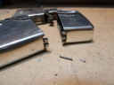 ヒンジ修理はヒンジシャフトを入れ直し溶接にて抜けないように加工しました。ふたを開けるとインサイドユニットがケースにぴったりとおさまっていて手で引っ張ってもインサイドユニットが抜けず、これではオイルが入れられず火がつかない状態になってしまいます。